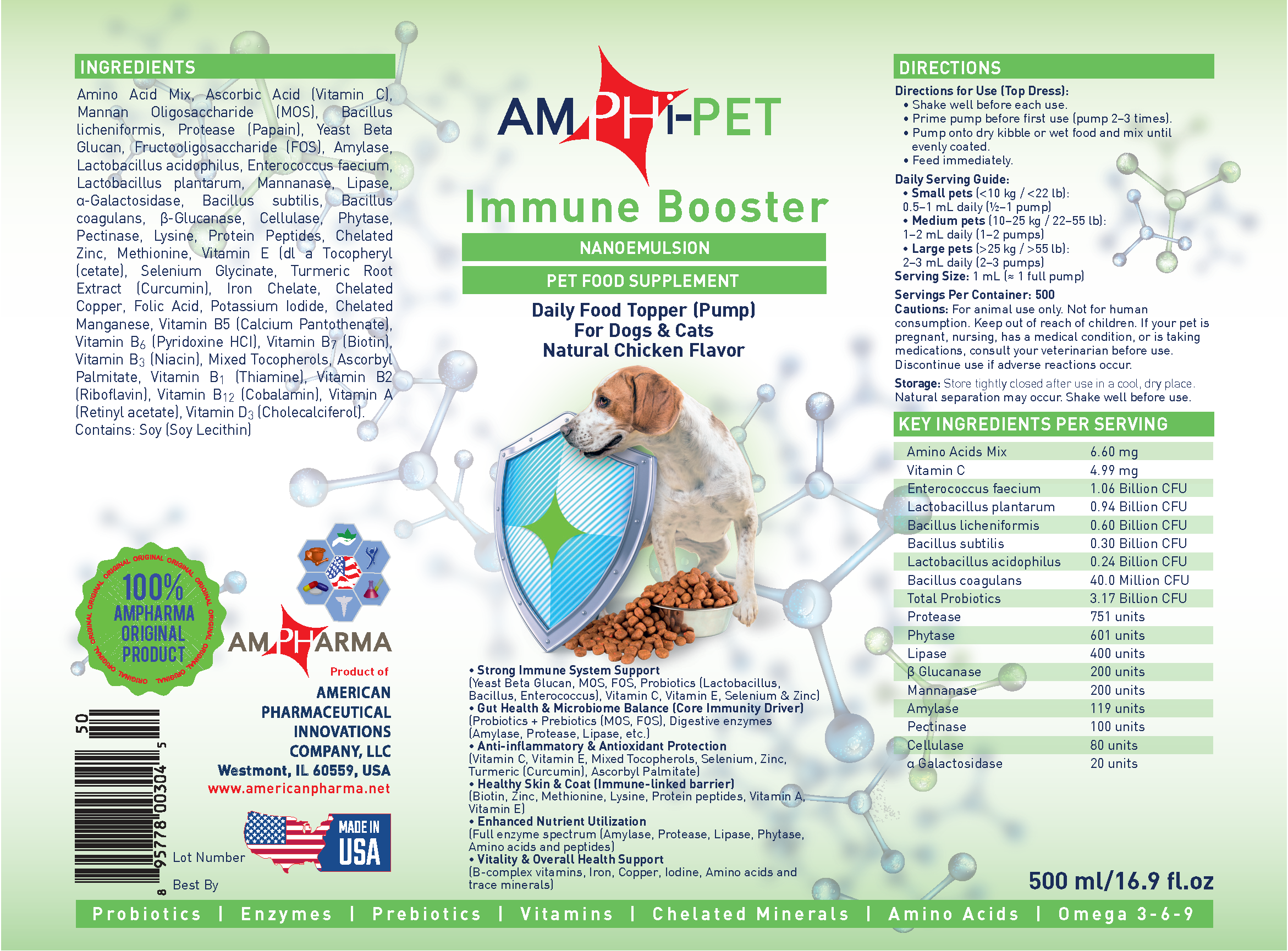 - AmphiPET Immune Booster nanoemulsion liquid is a premium immune-support formula for pets, designed to strengthen natural defenses, protect against infections, and promote vitality. It combines antioxidants, omega fatty acids, prebiotics, vitamins, chelated minerals, amino acids and turmeric extract to enhance immune response and overall well-being.